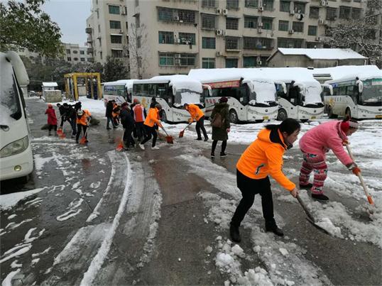 工作人員與志愿者一起清掃積雪,做好站場(chǎng)防滑措施(汽車南站)