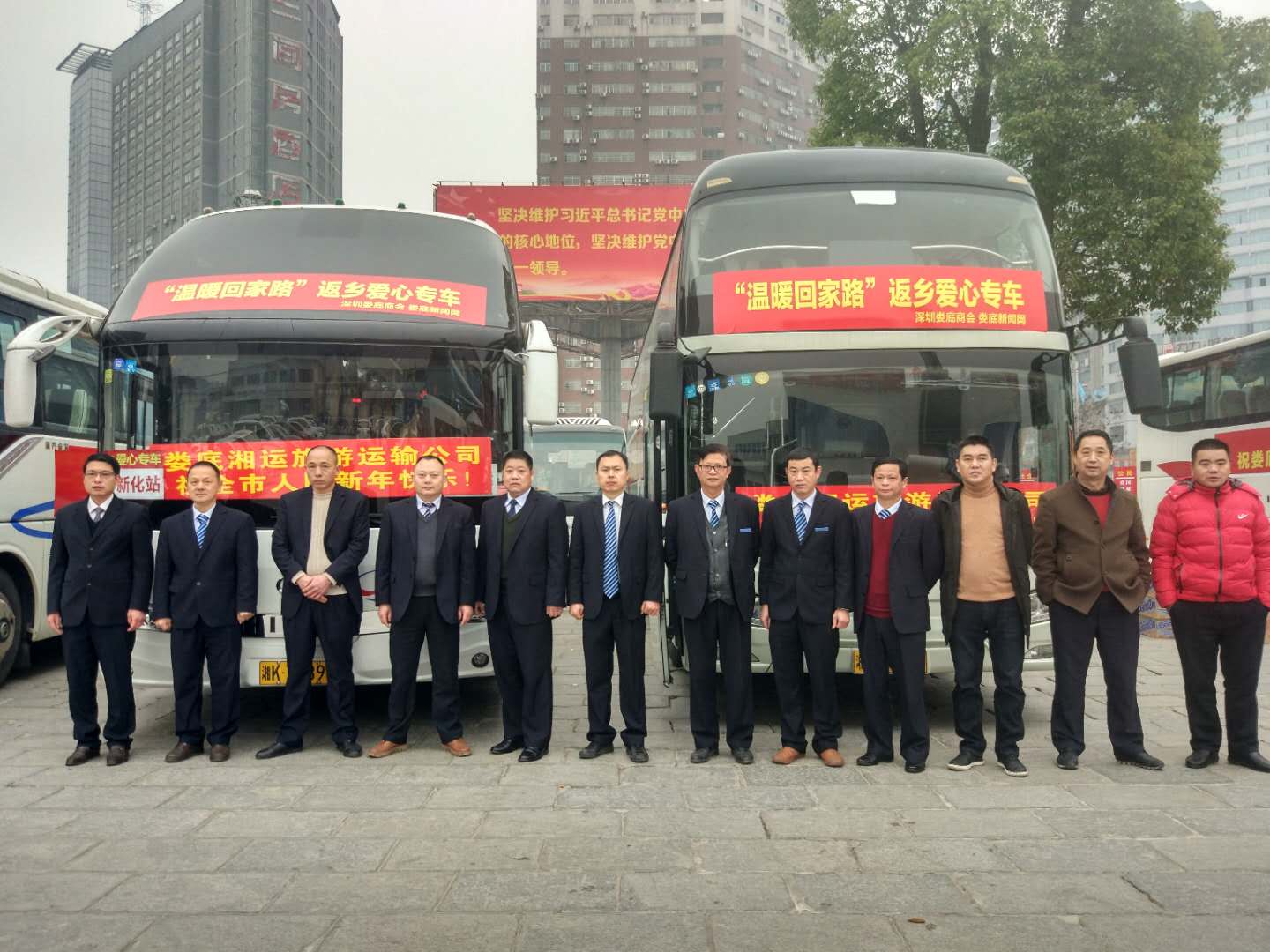 參加"溫暖回家專車″活動(dòng)的公司管理人員和駕駛員